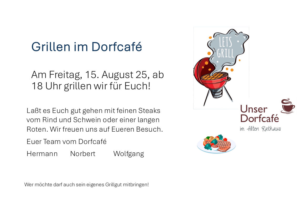 Grillen im Dorfcafé 12. August 2025 / Termin Details Datum: 15. August 2025 18:00 – 21:00 Ort: Altes Rathaus Grunern mit Dorfcafé