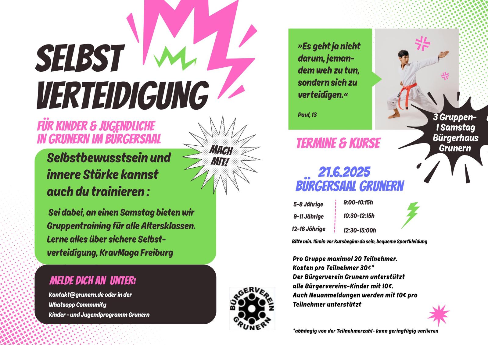 Liebe Eltern, Am 21.6 finden drei Selbstverteidigungskurse für Kinder und Jugendliche in Grunern statt. Dem Plakat können Sie alle Infos entnehmen! Melden Sie sich gerne!