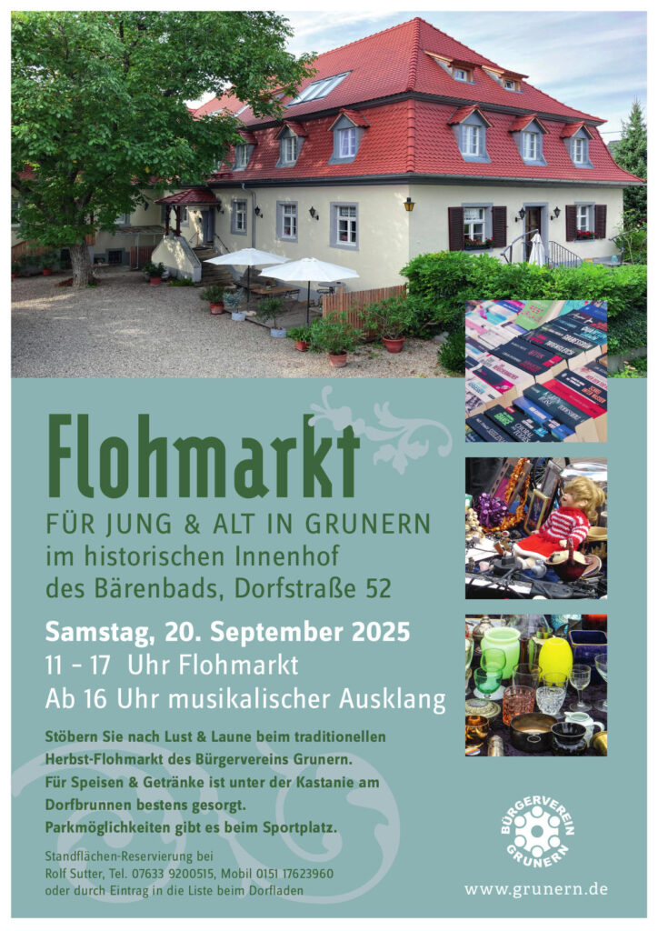 Die Bewohner des Bärenbads und der Bürgerverein Grunern laden zum Hof Flohmarkt am 20.09.2025 am Bärenbad in Grunern ein.
