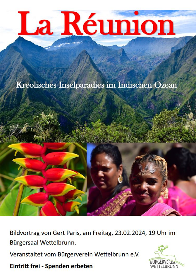 Bildvortrag „La Réunion“ von Gert Paris 18. Februar 2024 / Termin Details Datum: 23. Februar 2024 19:00 – 21:00 Ort: Bürgersaal Wettelbrunn
