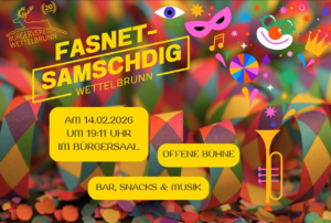 FASNET SAMSCHDIG, Bürgerverein Wettelbrunn 6. Februar 2026 / Termin Details Datum: 14. Februar 2026 19:11 – 22:00 Ort: Bürgersaal Wettelbrunn Veranstalter: https://www.buergerverein-wettelbrunn.de/