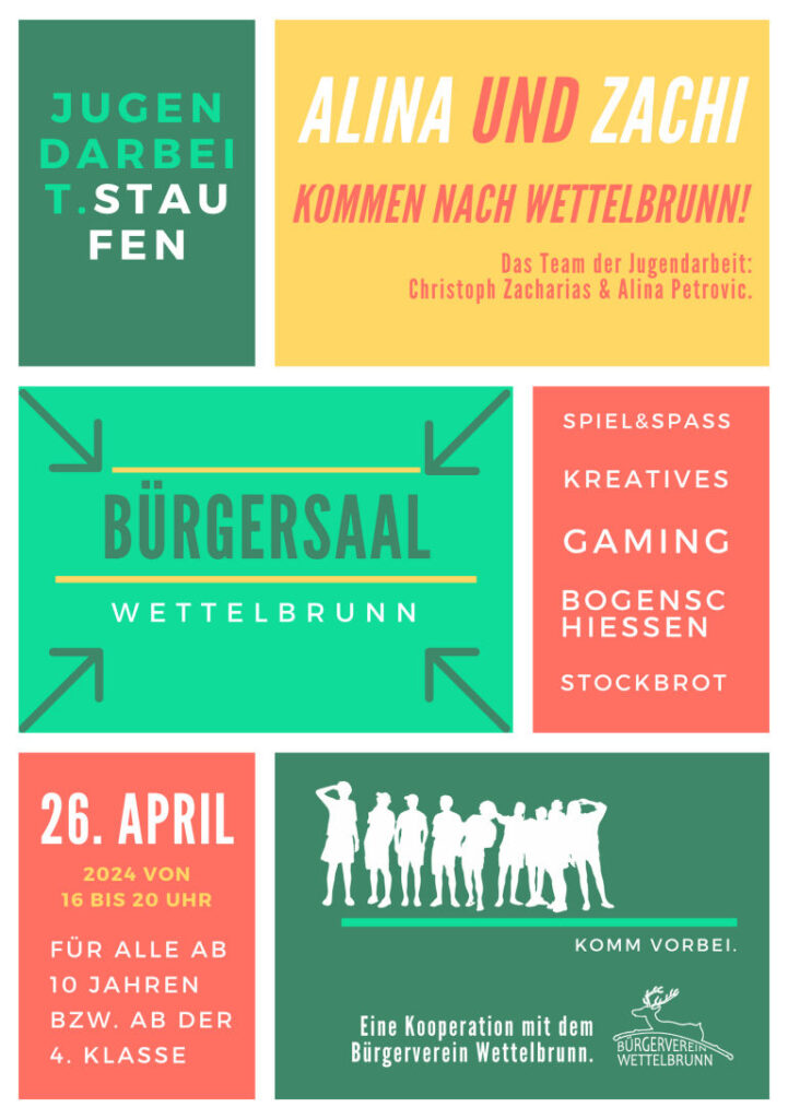 Jugendarbeit in Wettelbrunn 15. April 2024 / Termin Details Datum: 26. April 2024 16:00 – 20:00 Ort: Bürgersaal Wettelbrunn buergerverein-wettelbrunn.de