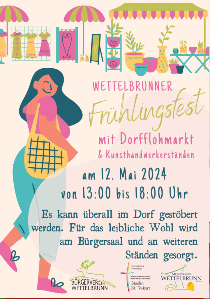Wettelbrunner Frühlingsfest mit Dorfflohmarkt 15. April 2024 / Termin Details Datum: 12. Mai 2024 13:00 – 18:00 Ort: Bürgersaal Wettelbrunn https://www.buergerverein-wettelbrunn.de/