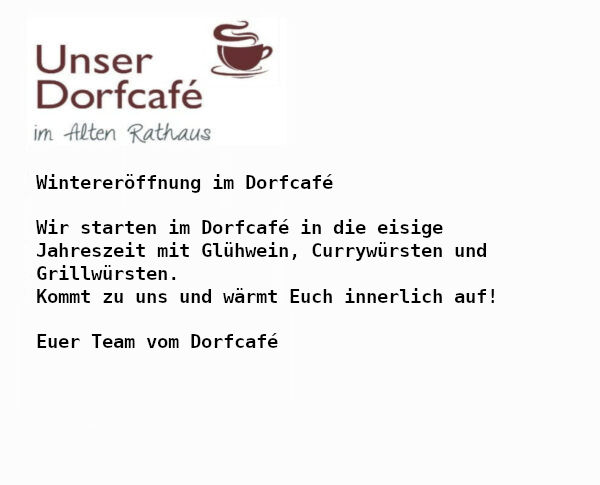 Wintereröffnung im Dorfcafé 21. November 2025 / Termin Details Datum: 21. November 2025 18:00 – 22:00 Ort: Altes Rathaus Grunern mit Dorfcafé