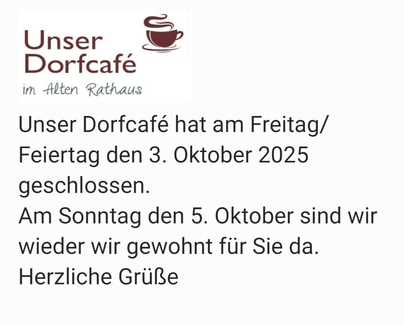 alle, UnserDorfCafé Kein Dorfcafé am 03.10. 26. September 2025 / Am Freitag, 03.10. bleibt Unser Dorfcafé zu, da Feiertag ist. Ab Sonntag 05.10. ist wieder wie gewohnt offen.