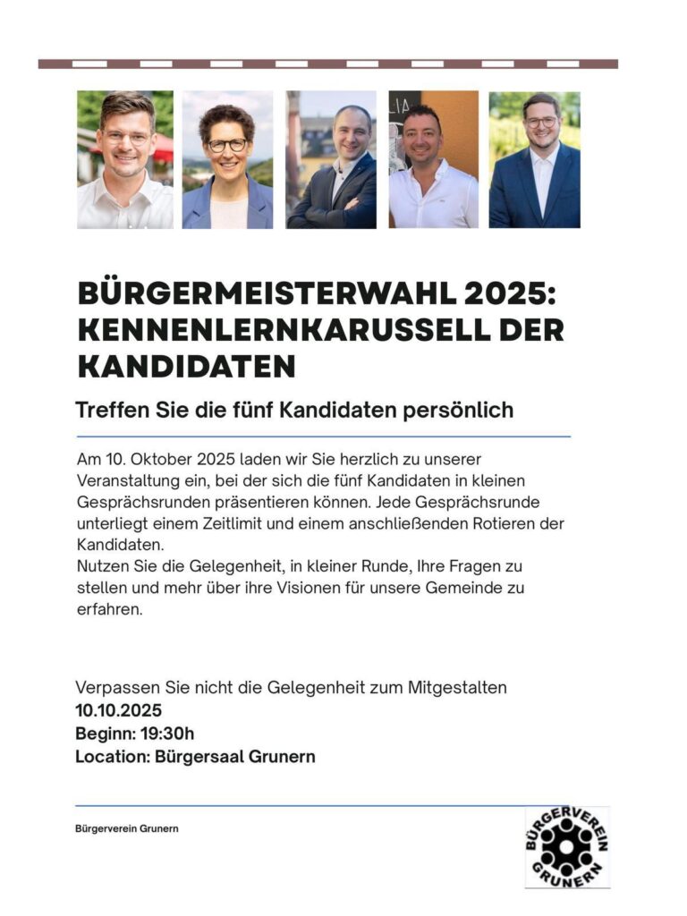 Demnächst findet bei uns im Bürgerhaus Grunern eine Befragung der Bürgermeister-Kandidaten statt: Am Freitag, 10.10. um 19:30 Uhr stellen sich die fünf Interessenten für das Bürgermeister-Amt vor. Wir laden sie herzlich ein.